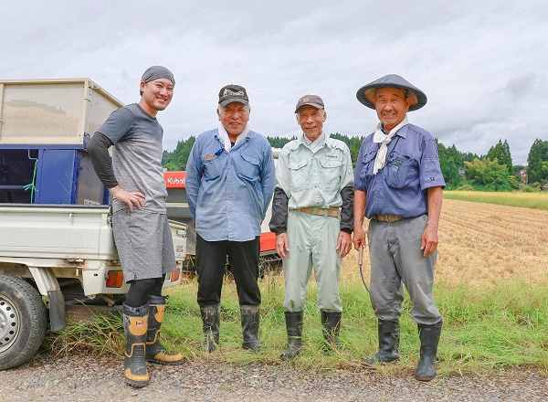 2024年秋の稲刈り時、左から、坂本氏と生産組合の人々