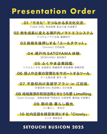 また、当日オーディエンス賞に投票した人の中から、抽選で10名に「せとうちビジネスコンテスト オリジナルTシャツ」がプレゼントされる。当選者は会場内で発表し、その場で渡されるとのことだ。