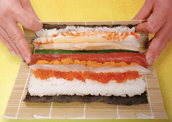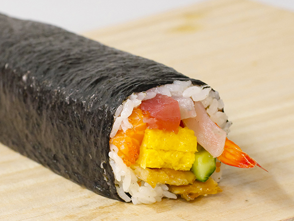 一つ目は、機械に頼らない“手巻き”であること。すべての恵方巻を職人が巻きすで丁寧にやさしく巻くことで、シャリのふっくらとした食感を楽しめる。