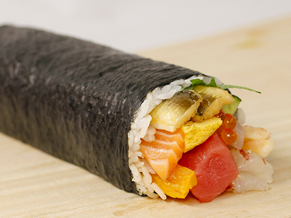 「特上海鮮巻」2,950円(税込)は、本まぐろが贅沢にずっしりと構える一品。具材は、本まぐろとろ/活〆真鯛/活鮮サーモン/赤海老/穴子/いくら/かにほぐし身/自家製玉子焼/きゅうり/たくあん/大葉の全11種。