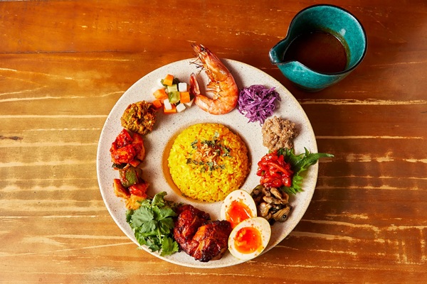 「9品のおばんざいとカレー出汁のスープカレー」は、魚介類を中心に素材の旨味をスパイスで存分に引き出した色とりどりのおばんざいを楽しめる、美味しさも見た目も贅沢な一皿。