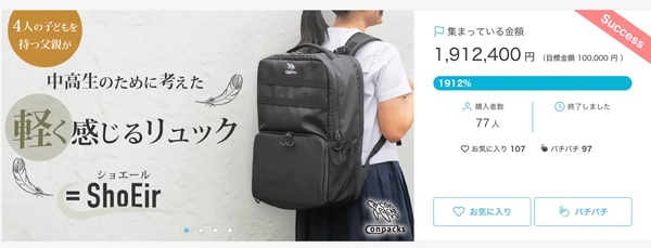 先行して実施したクラウドファンディング(Makuake、Creema SPRINGS)では、中高生の荷物の重さに悩む多くの保護者から支援を受けた。Makuakeでは目標金額の8027%を達成し、2つのプロジェクト累計で支援総額は約1,000万円に達している。