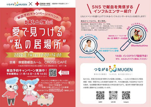 青年団体「つながるMUGEN」は、2月14日(土)、大阪・御堂筋献血ルーム CROSS CAFÉにて、献血イベント「#献血推し! 愛で見つける“私の居場所”」を開催する。