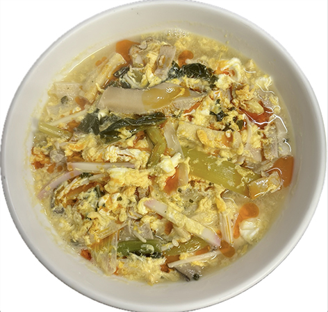幸手市の「自家製うどんパフェ喫茶くぅぅ」は、出汁の効いたうどんと甘くて美味しいパフェが同時に楽しめるうどん店。今回、提供する「長崎県産太陽卵の卵にこだわった酢辣うどん」は、自家製かけつゆと特製合わせ酢を使用し、7種類の食材をこだわり抜いた卵でとじた旨辛酢辣うどんだ。ラー油をかければ味変も楽しめる。