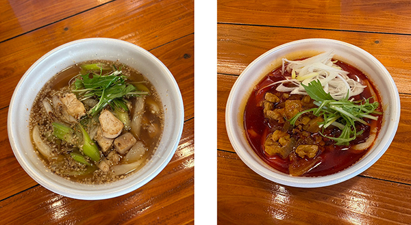 さいたま市の「延喜」からは、「鶏肉とネギの胡麻かけうどん」と「大久保レッド」の2種類が登場。前者は鶏肉とネギを油で炒め、すりごまをたっぷりかけた一品。後者は、千葉県のご当地ラーメンをイメージし、豚肉・ひき肉・玉ねぎをラー油で揚げ煮した具材が特徴のうどんだ。