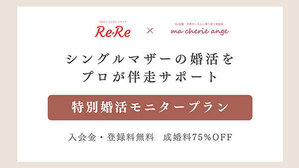 子どもがいる人向けのWebメディア・マッチングアプリ、シングルマザー向けのコミュニティアプリを運営するReRe(リリー)は、IBJ正規加盟の結婚相談所「ma cherie ange(マシェリー アンジュ)」と共同で、『シングルマザー 特別婚活モニタープラン』を実施する。