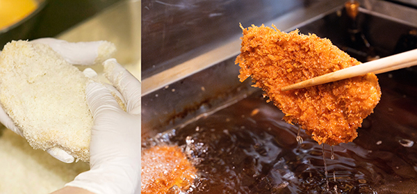 サシ(脂)に含まれるオレイン酸由来の「口どけの良さ」を損なわないよう、知多家の熟練職人が最適な温度と時間を見極め、シンプルに揚げて提供する。