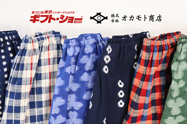 福岡県久留米市に本社を置くオカモト商店は、2月4日(水)~6日(金)、東京ビッグサイトで開催される「第101回 東京インターナショナル・ギフト・ショー春2026(以下、東京ギフトショー)」に出展する。日本の重要無形文化財「久留米絣」を用い、「JAPAN」ロゴやアニマル柄といった遊び心のある新作雑貨やアパレルアイテムを公開する。