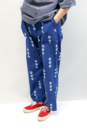 「もんぱん」は、日本に古くから伝わる作業着・野良着を原点に、現代の生活にフィットするかたちへと再構築した定番アイテムである。動きやすさと心地よさ、そして久留米絣ならではの豊かな柄と風合いを兼ね備え、年齢や性別を問わず支持を集めている。