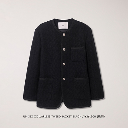 「UNISEX COLLARLESS TWEED JACKET」40,590円は、ハーフ丈のオーバーフィット・ノーカラーツイードジャケット。抑制されたシルエットに、さりげないシルバー調ボタンがアクセントを添える。カジュアルからフォーマルまで幅広く活躍する一着だ。