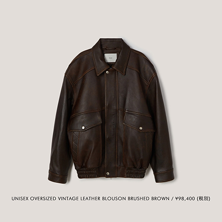 「UNISEX OVERSIZED VINTAGE LEATHER BLOUSON」108,240円は、80~90年代のヴィンテージムードを落とし込んだレザーブルゾン。ボリューム感のあるオーバーサイズシルエットとフロントアウトポケットが、デザイン性と実用性を両立している。