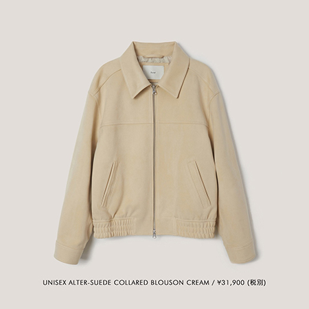 「UNISEX ALTER-SUEDE COLLARED BLOUSON」35,090円は、ヴィンテージ感漂うエコスエード素材のブルゾン。上質なスエードの質感を再現した柔らかなタッチと軽やかな着用感が特徴。ドロップショルダーと2WAYジップで洗練されたスタイリングが楽しめる。