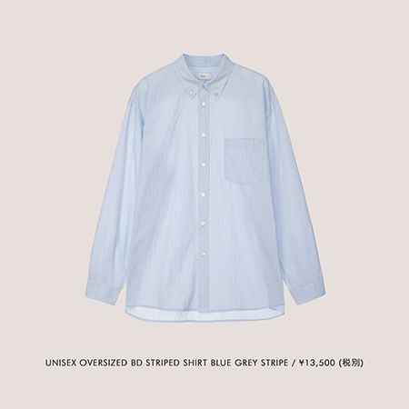 「UNISEX OVERSIZED BD STRIPED SHIRT」14,850円は、クラシックなストライプを現代的に再解釈したオーバーサイズシャツ。落ち着いたカラーとゆとりのあるフィットが、リラックス感とトレンド感を演出する。