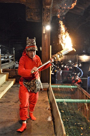 長さ約3m、重さ約30kgの大松明を掲げた赤鬼を先頭に、剣を振りかざす青鬼、棍棒を担いだ黒鬼が登場し、不動堂の回廊を荒々しく足を踏み鳴らしながら3周する。真っ赤に燃え盛る大松明の火は、大護摩供で焚かれた火を移したもので、迫力満点。松明の火の粉を浴びるとその一年間は息災に過ごすことができるといわれ、赤鬼が激しく乱舞する姿に境内で待ち構えた参詣客から大きな歓声が沸き起こる。