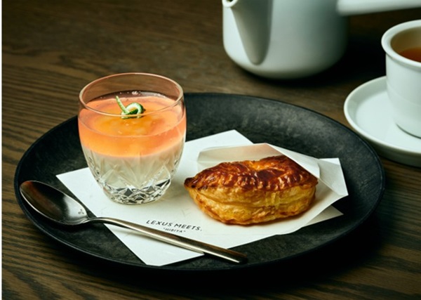 東京ミッドタウン日比谷1Fのカフェラウンジ「LEXUS MEETS…(レクサス ミーツ)」では、期間限定メニュー「トヨタ×道セレクション」として、富山県高岡市とコラボレーションした「アップルパイと米粉のムース」を1月30日(金)から提供している。