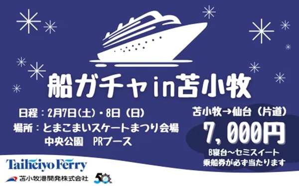 名古屋・仙台・苫小牧間でフェリーを運航する太平洋フェリーは、2月7日(土)・8日(日)に北海道苫小牧市で開催される「第60回 とまこまいスケートまつり」に苫小牧港開発と共同出展し、「船ガチャin苫小牧」を開催する。
