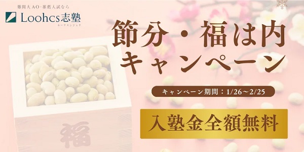 総合型選抜(旧AO入試)専門塾 Loohcs(ルークス)志塾が、総合型選抜・推薦入試に向けた早期対策を後押しする取り組みとして、「節分・福は内キャンペーン」を、1月26日(月)〜2月25日(水)の期間限定で実施中だ。
