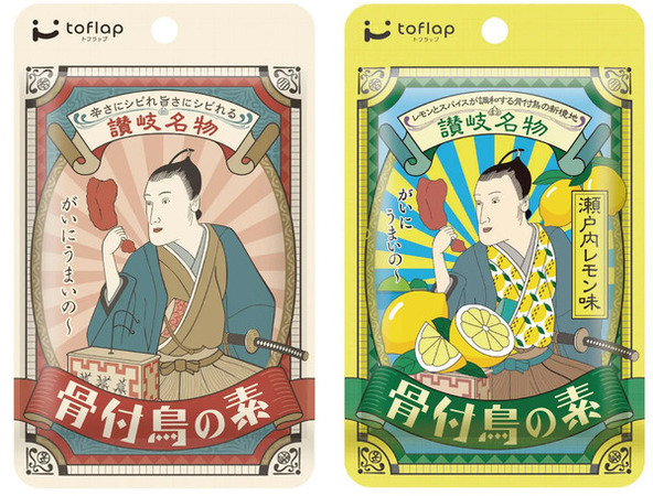 「骨付鳥の素」のパッケージには、香川県ゆかりの発明家・平賀源内を起用。彼が復元した「エレキテル」は、しびれる箱とも呼ばれた装置だ。実はこの「シビれる」が、辛さと旨さがビリッと走る骨付鳥の味わいとリンクしており、トフラップはこの言葉遊びを込めて源内を採用したという。
