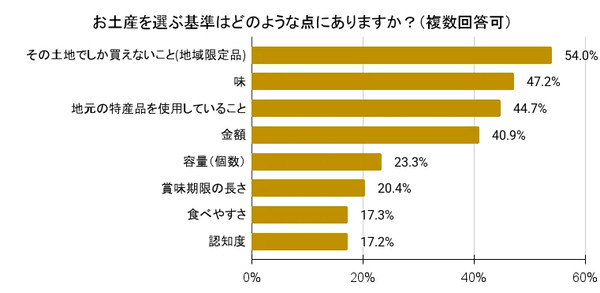そして、ゼネラルリサーチ「ご当地お土産に関する調査」2022年によると、お土産選びで最も重視されるのは「その土地でしか買えないこと(地域限定品)」で54.0%。