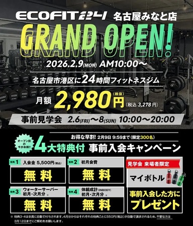 「エコフィット24 名古屋みなと店」では、グランドオープンに先立ち、2月6日(金)〜8日(日)の期間、予約不要・参加無料で参加できる事前見学会を開催する。