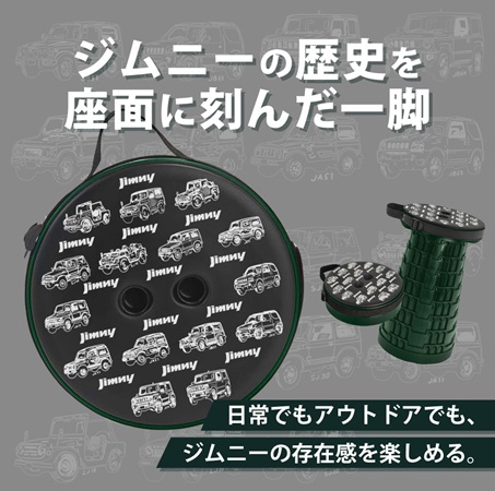 スズキ公認!歴代「JIMNY」が描かれた折りたたみスツール、初回1000個限定生産!