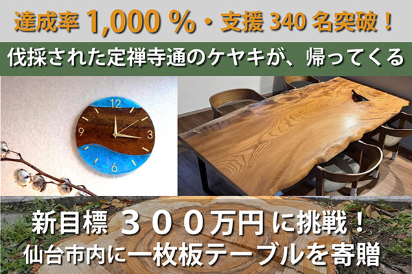これを受け、支援総額300万円を新たな目標(ネクストゴール)に設定し、達成時には同ケヤキ材を使用した「一枚板テーブル」を制作、仙台市内の施設へ寄贈する挑戦を開始した。同プロジェクトは2月28日(土)まで実施する。