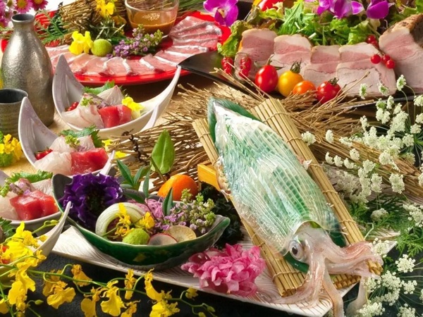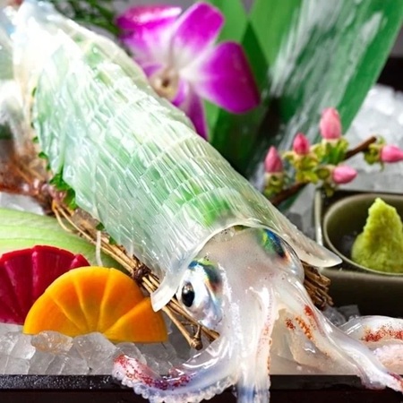 先付けから始まり、「刺身盛り合わせ」に続いて「カワハギ」または「活イカ」などの新鮮な海鮮を味わい、「炉端焼き」まで海鮮を主役に楽しめる構成。ベースを鍋ありか鍋なしかを選べて、鍋は“博多名物の”「水炊き」「もつ鍋」から1品、鍋なしは「炊き立ての”釜めし”」が堪能できる。