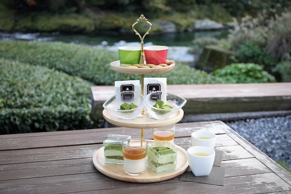 池川茶園 工房Cafeの「仁淀ブルーを眺めながらの絶景アフタヌーンティー体験」1人2,900円では、おすすめの土佐茶2種と土佐茶を使った手作りスイーツ5種を3段スタンドで提供。仁淀ブルーを眺めながら非日常のひとときを過ごすことができる。
