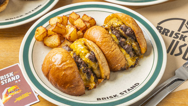 「BRISK STAND」の代名詞メニューは「切ったやつ ダブルパティ」2,500円(税込)。ただ切っただけではなく、パティから出た肉汁を半分に切った断面に吸わせて、半分に切った断面を熱々の肉汁で2度焼きし、断面をカリカリにして提供している。