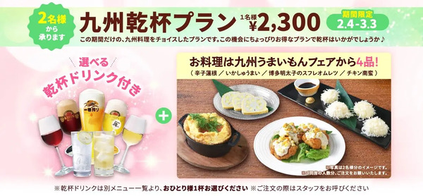 期間限定の選べる乾杯ドリンク付「九州乾杯プラン」では、「辛子蓮根」「いかしゅうまい」「博多明太子のスフレオムレツ」「チキン南蛮」がセットになっている。価格は1名2,300円で、2名から注文可能だ。