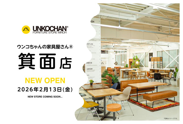 家具と雑貨のワンダーランド「ウンコちゃんの家具屋さん」は、大阪府・兵庫県下で5店舗目、広さ1,315㎡の「ウンコちゃんの家具屋さん 箕面店」を2月13日(金)にオープンする。