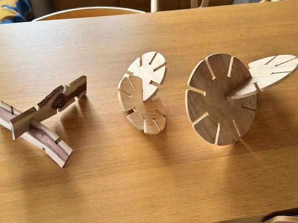 左から被曝樹木・広島県産材檜・リサイクル木材