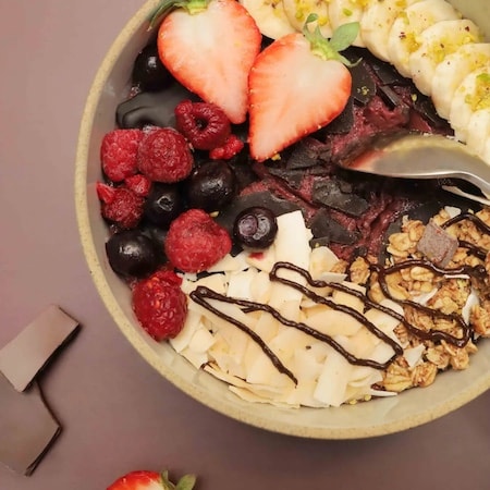 「クラッキングアサイーボウル」は、チョコレートを“割って”食べる、新感覚のアサイーボウル。もったりとしたアサイーベースの上に、チョコレートをコーティング。スプーンで軽く叩いて割り、食べるとパリパリと心地よい音と食感が楽しめるのがオススメポイントだ。