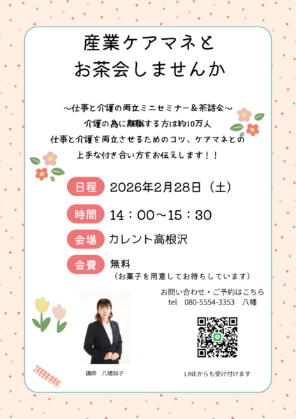 2/28(土) 産業ケアマネとお茶会しませんか〜仕事と介護の両立ミニセミナー&茶話会〜