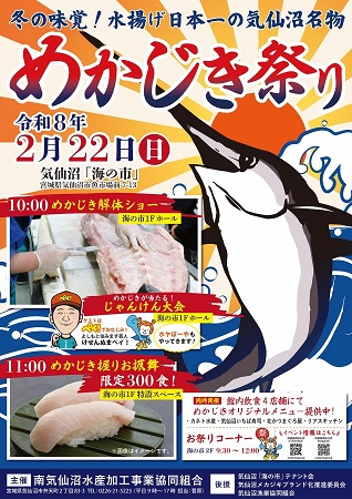 南気仙沼水産加工事業協同組合は、気仙沼「海の市」にて、2月22日(日)に「めかじき祭り」を開催する。