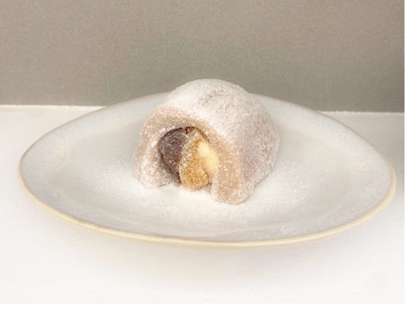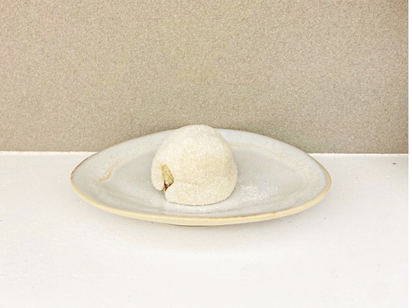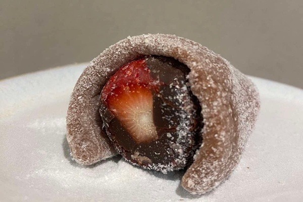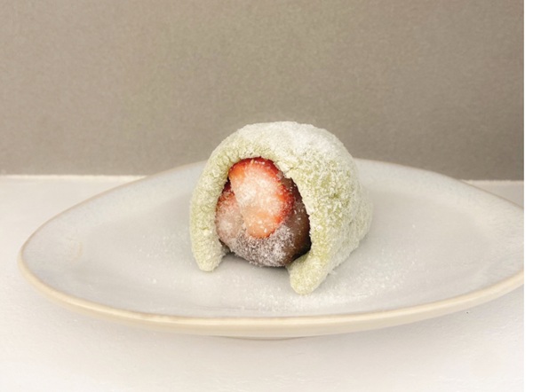ココアを練り込んだ求肥の中には、チョコレートでコーティングしたいちごと秋田県産いちじくを丁寧に炊き上げた甘露煮が包み込まれている。いちごの軽やかな酸味といちじくの凝縮された甘みがココア求肥のやわらかな食感と重なり合い広がっていくのは、この時期ならではの味わいだ。