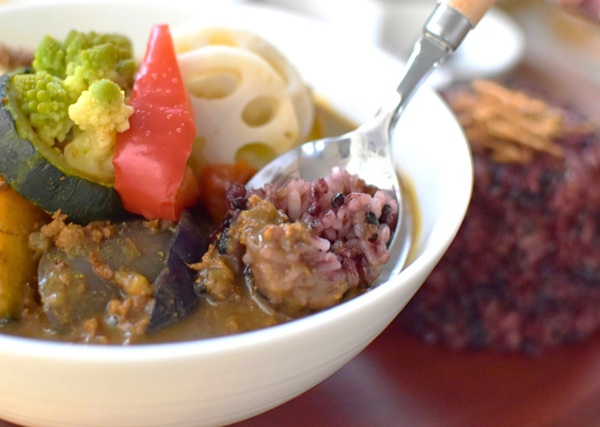 また、カレーの中にはキャベツ、蓮根、ドライトマト、ズッキーニ、なす、ロマネスコ、じゃがいも、パプリカ、かぼちゃのごろごろ野菜が9種類盛られていて、食べ応え抜群。