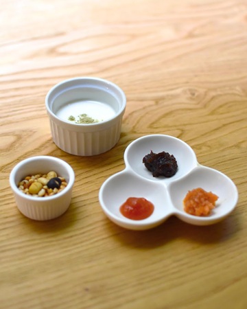 さらにチャツネで味を変えたり、黒文字パウダーとヨーグルトを入れてまろやかにしたり、小川生薬オリジナルの国産はとむぎグラノーラでカリッとした食感をプラスしたりと、一皿で何通りもの楽しみ方ができるように設計。