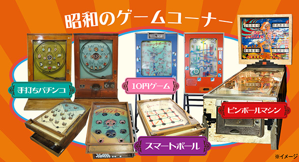 昭和のゲームコーナーには10円ゲーム、スマートボール、手打ちパチンコ、そしてピンボールマシンが。