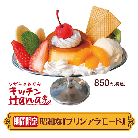 園内レストラン「キッチンHana」では、期間限定で昭和な「プリンアラモード」が850円(税込)で味わえる。