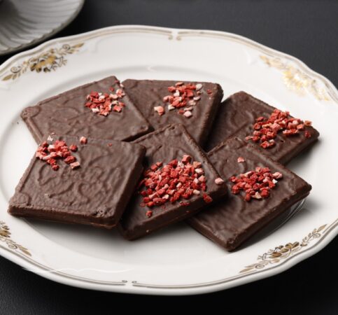 苺果汁を練り込んだ生地に、苺のフリーズドライ粉末を混ぜた特製チョコをサンドしている。さらに全体をクーベルチュールチョコレートでコーティング。長崎県産素材を大切に、生産者と共に歩んできた老舗だからこそ実現できた、期間限定の特別な味わいだ。
