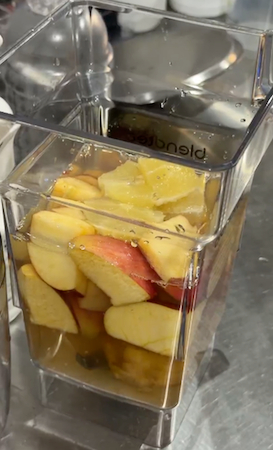 製法については、まず生の生姜、赤リンゴ、レモン、ジャスミンティーなどをミキサーに入れ、なめらかになるまで攪拌。