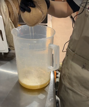 その後、布でしぼり濾すことで、繊維質のない口当たりなめらかなジュースが完成する。