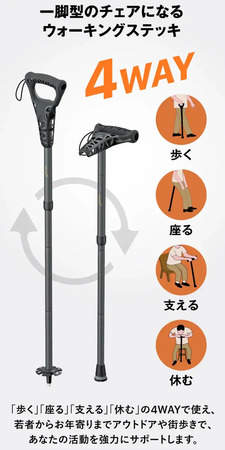 内閣府調査では、60歳以上の高齢者の約8%が「休憩場所が少なく外出しづらい」と回答している。「WALKSIT」は、“歩行サポート+休憩”をたった一本に集約した新しいモビリティギアとして注目されているそうだ。