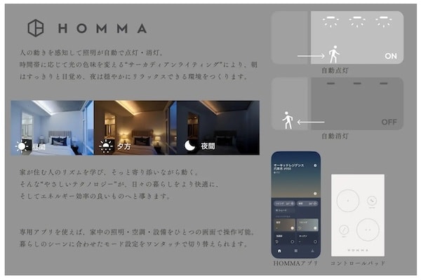 「HOMMA」の「Built-in Intelligence(ビルトイン・インテリジェンス)」は、スマートホーム機器とセンサーが最初から住宅に組み込まれているため、居住者による事前の設定や複雑な操作は不要。人の動きを感知して照明が自動で点灯・消灯するシステムや、自然の光の移ろいに合わせて照明を5つの時間帯で調整するサーカディアンライティングなどを備えているため、居住者は入居初日から質の高い生活が得られるだろう。
