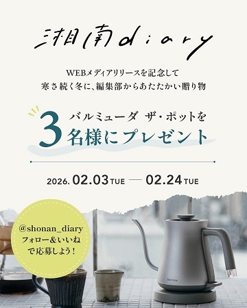 「湘南diary」では、サイト公開を記念して、2月3日(火)よりプレゼント企画を実施している。プレゼントは、編集部が読者の日常の中にほんの少し“あたたかい時間”が生まれるようなものを選んだという。応募条件などの詳細は、「湘南diary」公式Instagramで確認を。