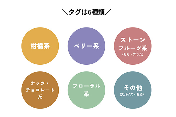 「タグ」は、「柑橘系」「ベリー系」「ストーンフルーツ系(もも・プラム)」「ナッツ・チョコレート系」「フローラル系」「その他(スパイス・お酒)」の6種。