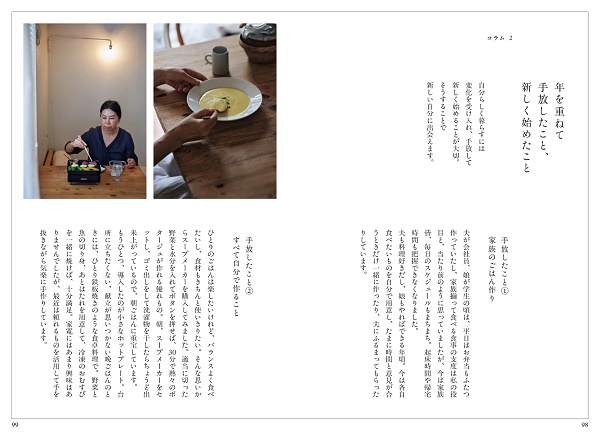 『年を重ねて今を彩る 暦の手仕事』では、四季折々、仕込みものを使う料理、季節の味覚料理、ルーティーン、季節ごとのおやつなど、春夏秋冬、素材本来の旨味や風味が存分に味わえる、“滋味深い”たまさん流レシピ全84品を収録している。
