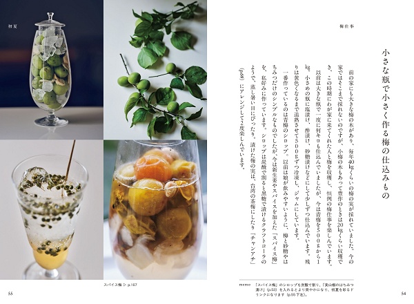 初夏のレシピは、実山椒のオイル漬け、スパイス梅、らっきょうの味噌漬け、新生姜の甘酢漬け、杏の赤じそ漬け、鮎のコンフィなど。