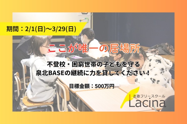 志塾フリースクールラシーナは、2月1日(日)〜3月29日(日)の期間、持続可能な支援体制の構築に向けたクラウドファンディングを開催中。志塾ラシーナは「自ら学びを選択し、自ら未来を思い描く」という理念のもと、不登校児童生徒やその家族が社会から孤立しないための包括支援を強化していく。